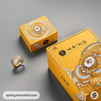 Luxurious gold ring box with detailed artwork.