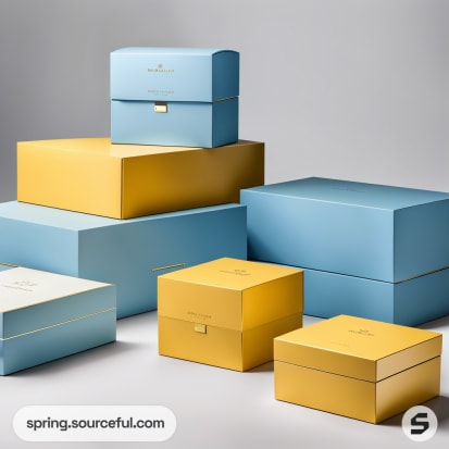 Assorted blue and yellow gift boxes with sleek design, open and closed, on a light grey background.