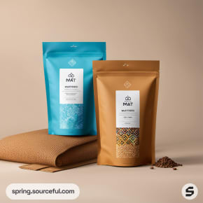 Brown resealable pouch with blue circular label