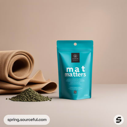 Teal resealable pouch with woven fabric and pellets