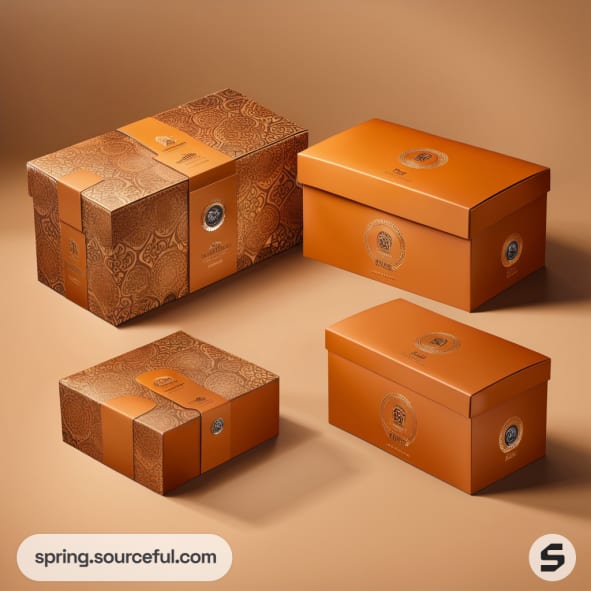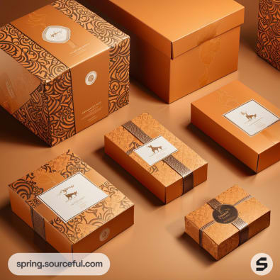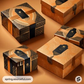 Elegant orange boxes with black and gold decorative patterns and sealed labels on various sizes.