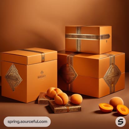 Three stacked orange gift boxes with ornate designs, surrounded by apricot fruits and chocolate, against a brown background.
