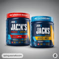 Two black-blue jars of Jack's Muscles supplements in bold design.