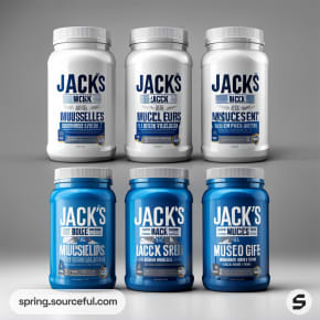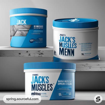 Three grey jars labeled Jack's Muscles with blue and orange design.
