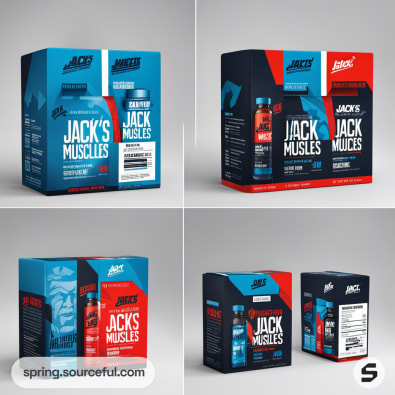 Four boxes of Jack's Muscles supplements with various colors and designs.