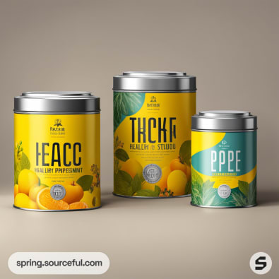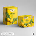 Yellow tin and rectangular boxes with fruit and leaf illustrations on white background.