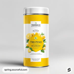 Metallic cylindrical container with a yellow and white label featuring lemons and green leaves.