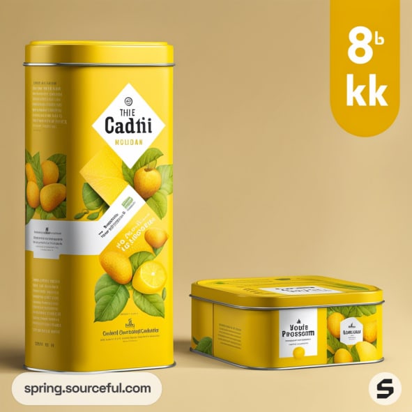 Tall and square yellow tins with lemon illustrations on a beige background.