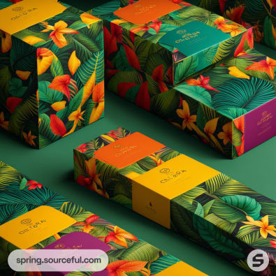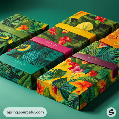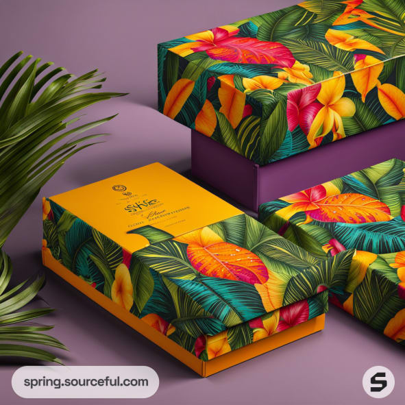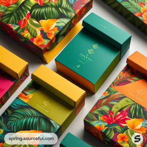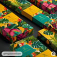 Colorful tropical-themed packaging boxes with floral patterns and vibrant colors like green, yellow, and orange.