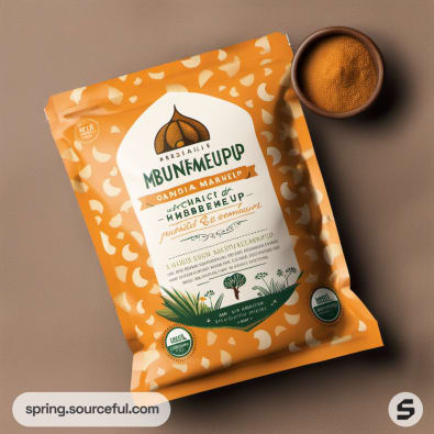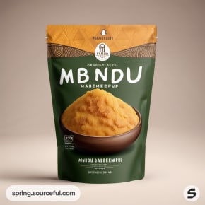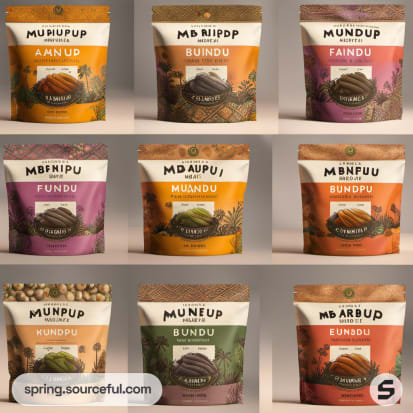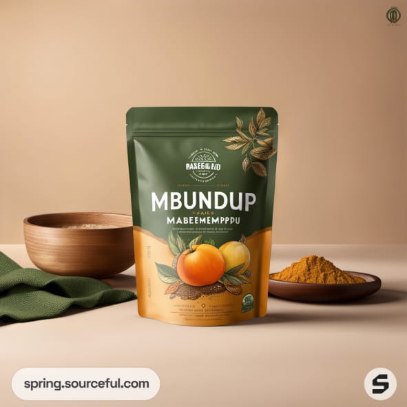 Two beige pouches with fruit and nut graphics, surrounded by ingredients.