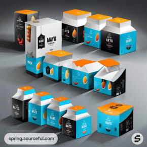 Assorted mayo mailer boxes with colorful ingredient designs and bold text.