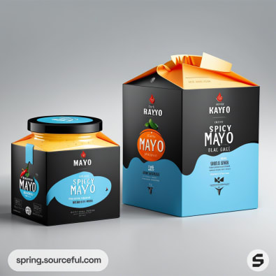 Hexagonal jar and carton box of spicy mayo with black, blue labels and orange accents on a gray background.
