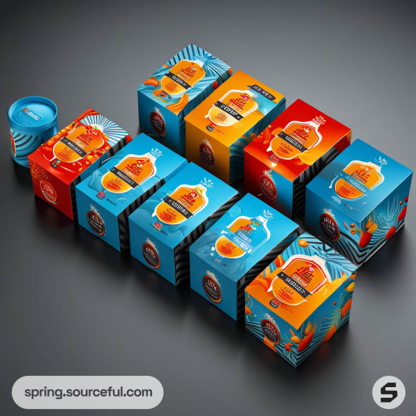 Assorted cube and carton packages with different designs and colors, featuring black, white, blue, and orange accents.