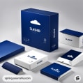 Blue and white packaging with cloud design, includes various boxes and pouches.