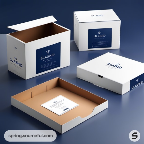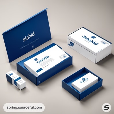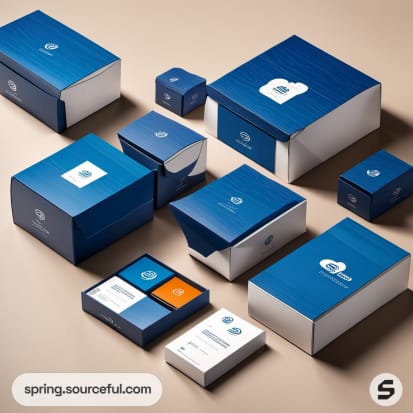 Assorted blue and white mailer boxes of various sizes on a beige surface.