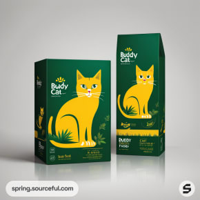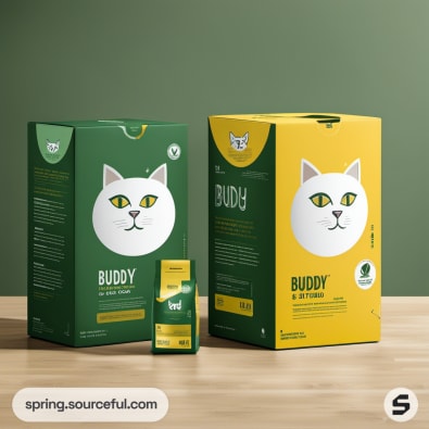 Close-up of yellow and green pet food boxes with cat illustrations.