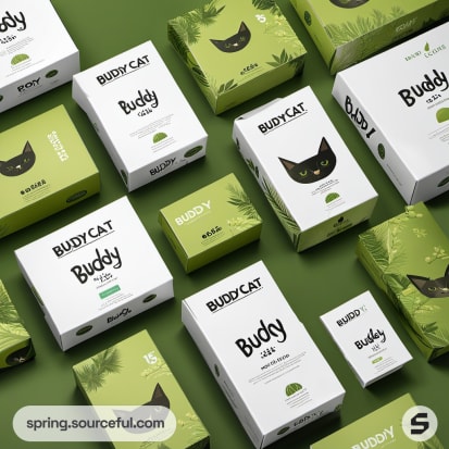 Assortment of green and white boxes with black cat graphics on green surface.