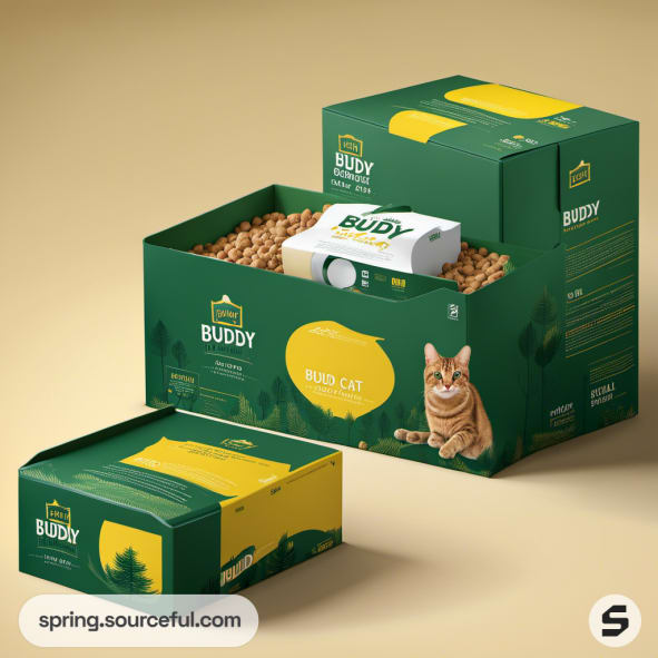 Three buddy cat boxes in shades of green and yellow with cat graphic and forest motif.