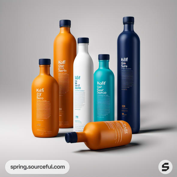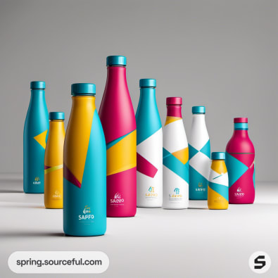 Colorful geometric patterned bottles in various sizes on a gray background.