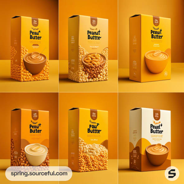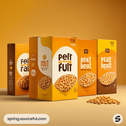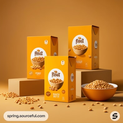 Peanut-themed cereal boxes on brown stands and a bowl.