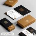 Business card set in black and gold with matching envelope and box on a grey background.