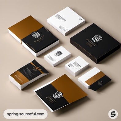 Assorted stationery with black, white, and gold color scheme, including boxes, envelopes, and documents on tan background.