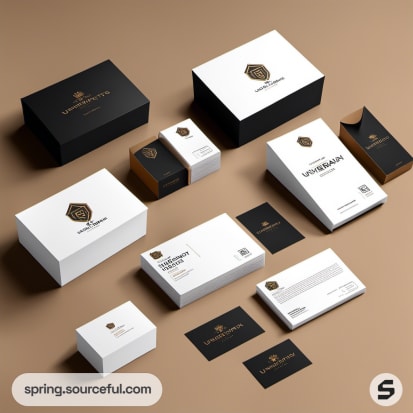 Collection of black and white packaging with gold accents, including boxes and business cards on a tan background.