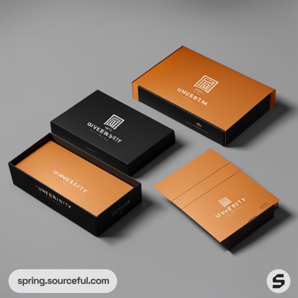 Orange and black university-themed packaging with two slide-open boxes and notebook on grey background.