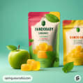 Green and yellow pouch with apple gummies on pink and gray background.