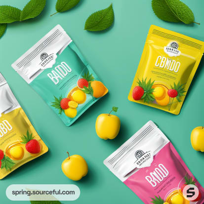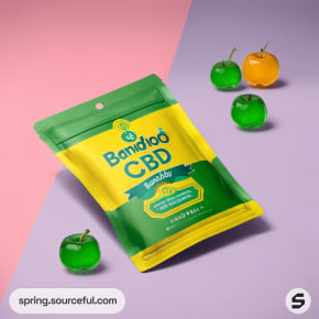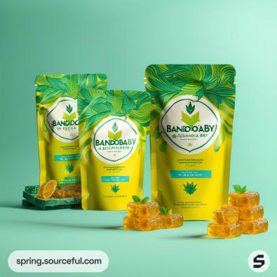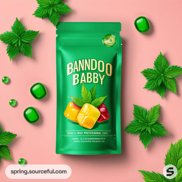 Green pouch with yellow gummies and leaves on pink background.