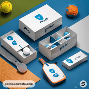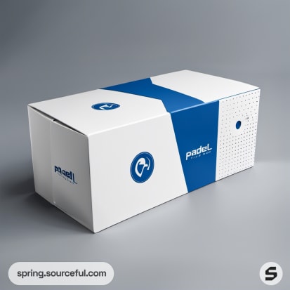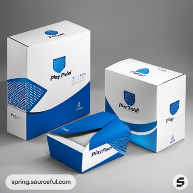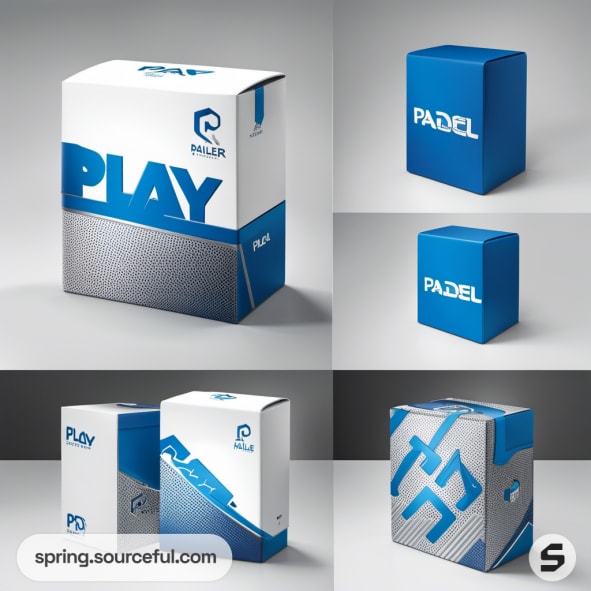 Hexagonal blue and white box with 'Play Padel' text branding.