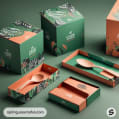 Green and beige packaging with leafy designs for utensils in a presentation box.