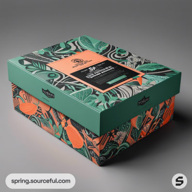 Colorful shoebox with botanical patterns, green lid, and orange accents on a gray background.