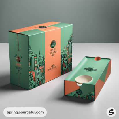 Green and orange illustrated cardboard box with cityscape design resembling mailer and cup packaging.