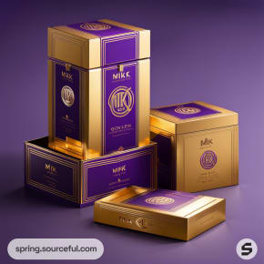 Gold and purple luxury boxes with elegant designs on a soft background.