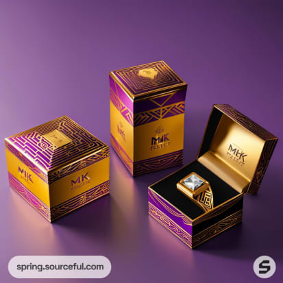 Stacked rectangular purple and gold boxes with striking geometric patterns.