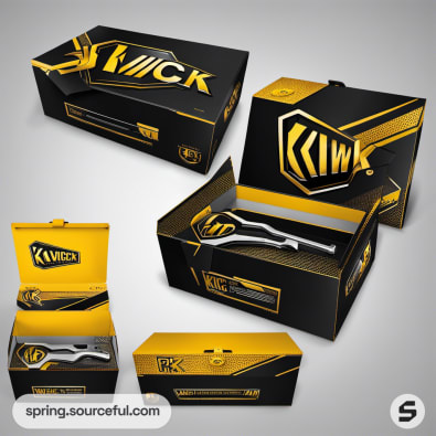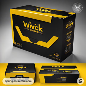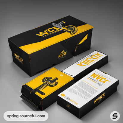 Stylish black and yellow packaging boxes, showcasing bold text and imagery, in various views.
